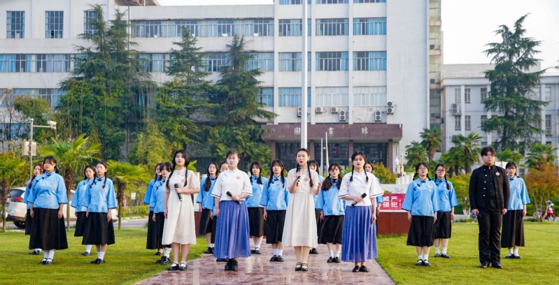 早上7时,升旗仪式正式开始。全体师生整装列队,肃穆而立。37位国旗班成员昂首挺胸、步伐铿锵、口号嘹亮、护送国旗。在嘹亮激昂的《义勇军进行曲》旋律中,鲜艳的五星红旗冉冉升起,全场师生礼敬国旗、高唱国歌、庄严肃立。