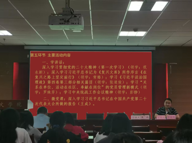 活动伊始,党员们集体唱国歌、重温入党誓词、交纳党费、诵读党章。“过政治生日”环节,刘建勋、曾颖二位同志分别结合自身的生活工作经验,表达出不忘初心、牢记使命的意志和决心。本次“主题党日”的学讲话环节,首先由祝永新同志领学党的二十大精神;其次由常璐同志领学习近平总书记为《复兴文库》所作序言《在复兴之路上坚定前行》;张道俊同志领学《习近平谈治国理政》第四卷第三部分相关篇目;罗姝芳同志领学“关系在单位、活动在社区、奉献在岗位”的党员管理新模式;四位同志分别谈了各自学习的心得体会。二支部书记彭静领学中央统战工作会议精神。