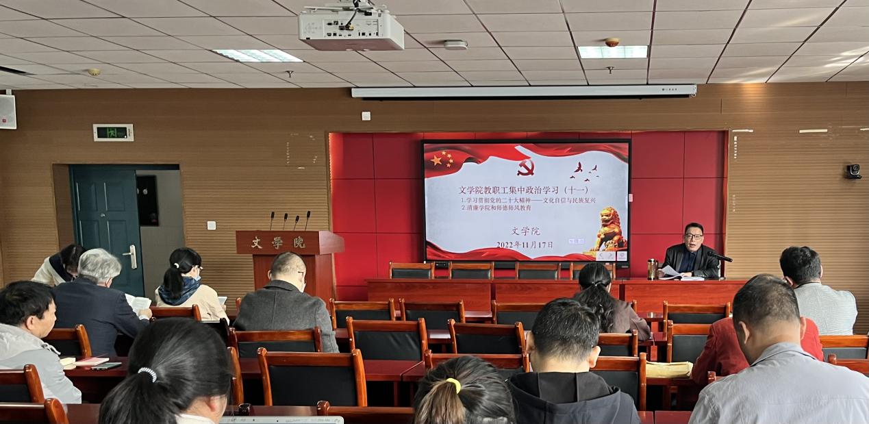 2022年11月17日下午,yl8cc永利线路检测中心党委在人文楼A-602学术报告厅召开全体教职工集中政治学习大会。会议由党委书记严志谷主持并讲授微课“文化自信自强与民族伟大复兴”。