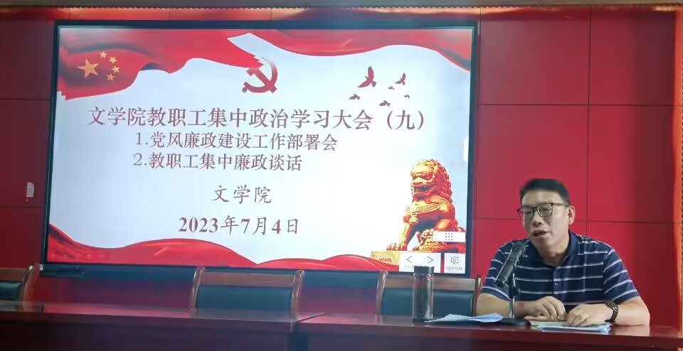 2023年7月4日下午,yl8cc永利线路检测中心党委于人文楼A-602学术报告厅召开本学期第九次教职工集中政治学习大会,本次大会共有五项内容:1.“以案说德”师德师风教育(二);2.yl8cc永利线路检测中心2023年党风廉政建设宣传教育月工作部署;3.教职工集中廉政从教谈话;4.学院主题教育开展情况通报;5.暑假重点工作安排。会议由党委委员、院长李治平主持,全院教职工参加大会。