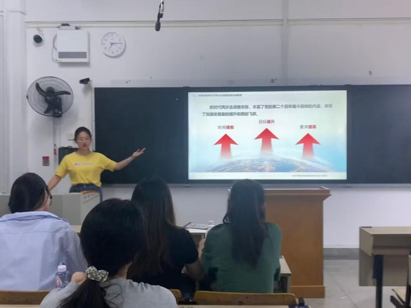 微党课环节,学生第一党支部罗进蓉、学生第二党支部刘莹、学生第三党支部邱珺妍等三位同志讲授“关于开启全面建设社会主义现代化国家新征程”的微党课。她们提到,全面建设社会主义现代化国家是一项伟大而又艰巨的任务。作为学生党员应该坚持恒心,在日常生活中努力学习习近平总书记讲话的核心精神,提高自觉意识,高举中国特色社会主义旗帜,全面贯彻新时代中国特色社会主义思想,面对任何风险挑战,要毫不动摇,毫不退缩,直至取得胜利。