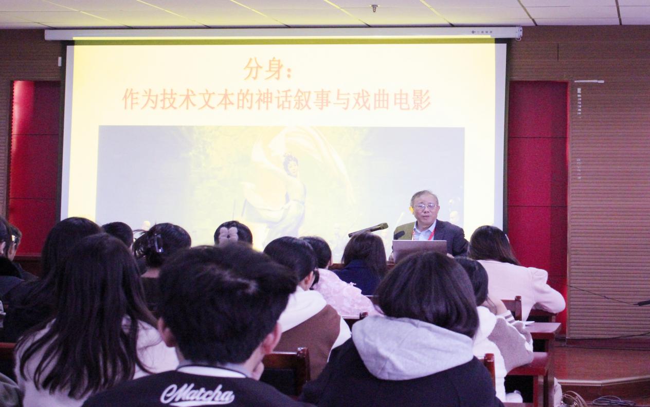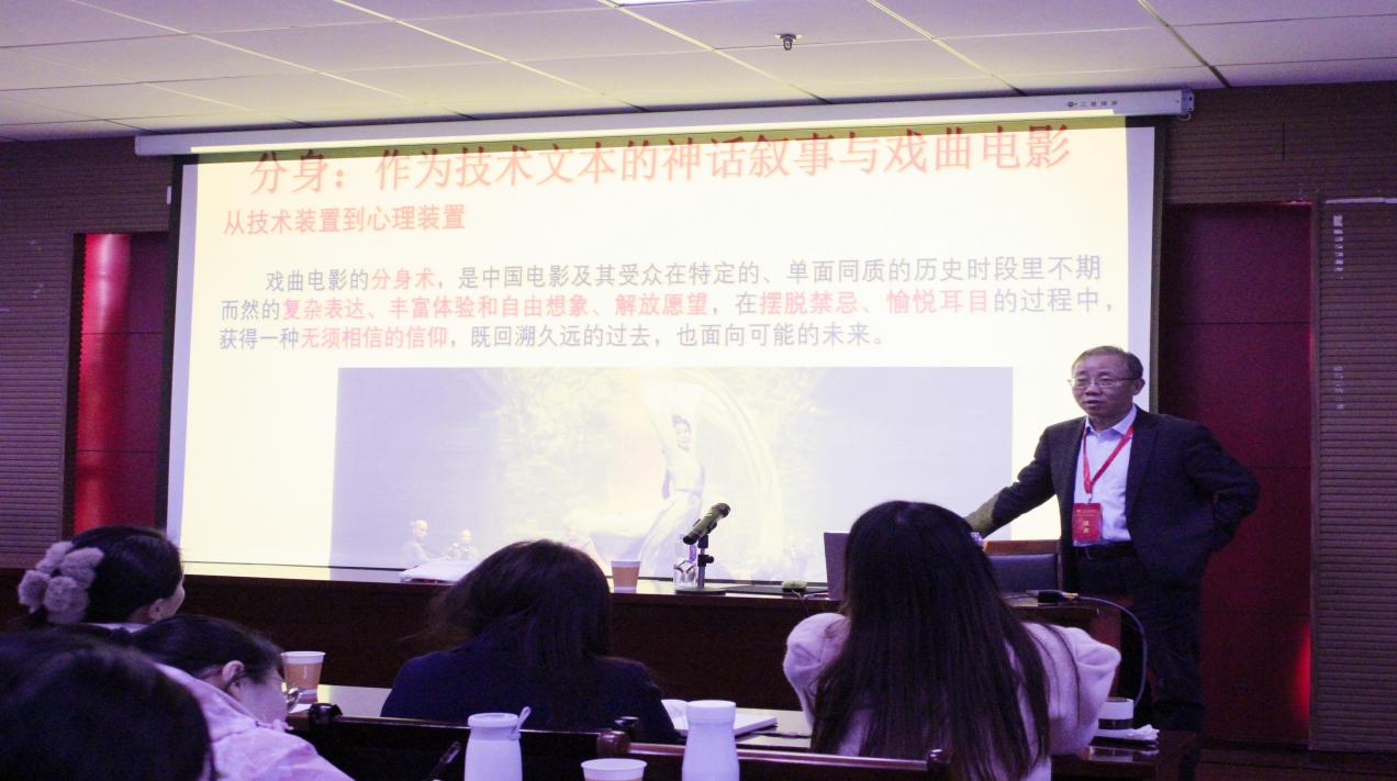 报告伊始,李道新以一个长辈、学长的身份幽默风趣地分享了成长的经历和喜悦,尤其是对理想、机遇把握的重要性强调,非常具有启发性和教育意义。接着他又以一位学者的身份用前沿的视角、厚重的文化品养、精深的理论,为我们带来了一场学术盛宴。李道新从中国电影平台建设、技术问题以及人文学科面对的困惑等方面谈起相关话题,启发观众思考。他以上古、宗教、民间、文学等传统神话叙事以及《梁山伯与祝英台》《天仙配》《孙悟空三打白骨精》《白蛇传》《追鱼》等戏曲电影为研究对象,就其最具技术与文化特征的分身术,探讨其独特的精神内涵与文化使命。李道新教授指出,神话叙事与戏曲电影的分身术,是中国文学、中国戏曲与中国电影及其受众在特定的、单面同质的历史时段里不期而获得的一种复杂表达、丰富体验、自由想象和解放愿望,在摆脱禁忌、愉悦耳目、抚慰身心的过程中,获得一种无须相信的信仰,既回溯久远的过去,也面向可能的未来。