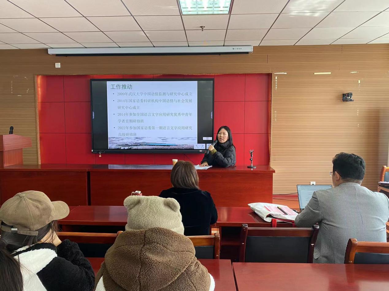 报告会开始,赫琳介绍自己的早期研究,提出自己的研究逐渐从语言学本体研究走向语言学应用研究。随后,赫琳介绍了这个课题的由来,并指出话语体系和话语权关系密切,话语权一直以来是比较热的问题。接着,赫琳介绍此次讲座的主要内容,主要分为三块,一是学术话语权的建设方向和提升路径,指出中国语言学话语权有内外之分,总方向是做大做强,其路径之一就是学术话语体系的建构。二是国际学术话语权的基本要素,主要包括三个:学术主体、学术权和语言权。三是中国语言学话语体系的构建和传播,介绍中国语言学话语体系的来源及我国语言学体系建设存在的问题,强调语言话语体系的传播对提升国际影响力的重要性。然后介绍了话语体系的建设维度,即主体价值体系、客体内容体系、传播载体体系和阐释体系,提出要做服务于社会的应用研究,并且要踏实做好本体研究。