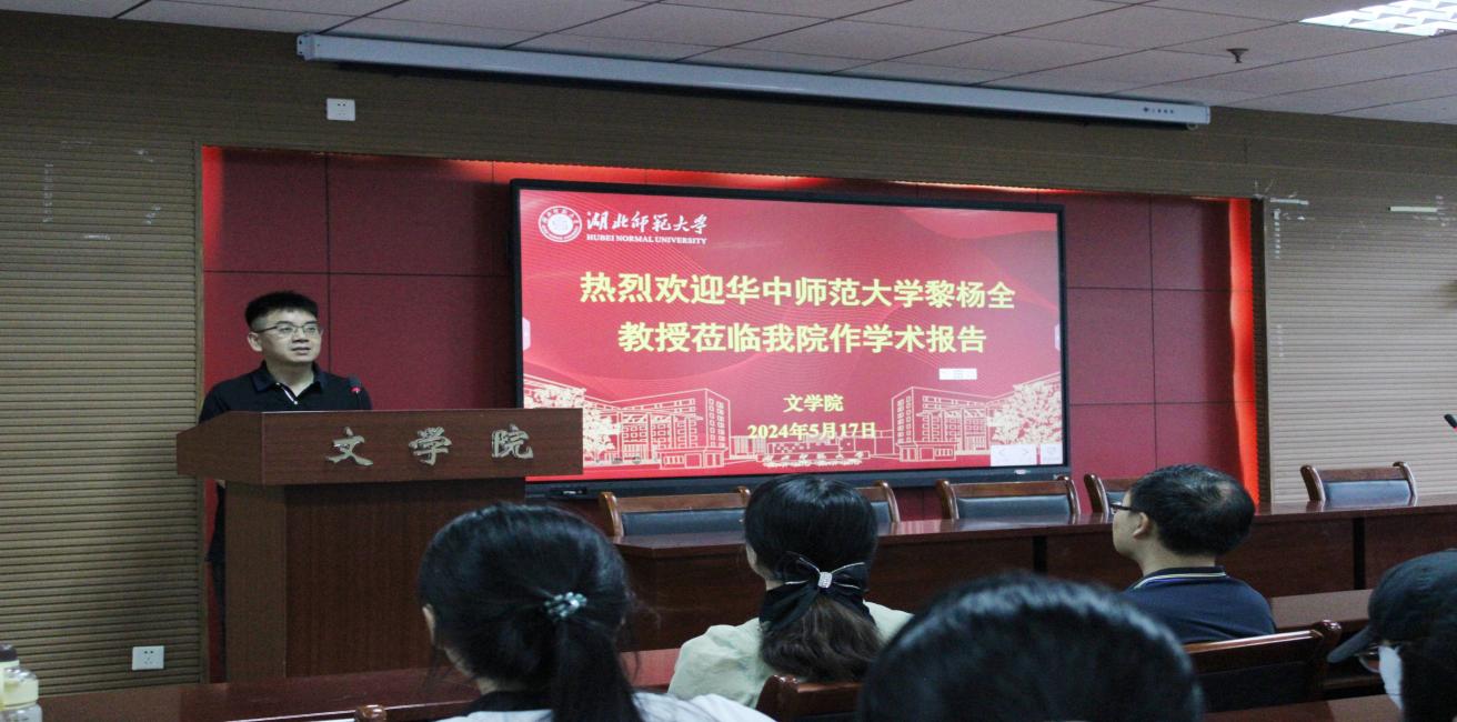 为提升yl8cc永利线路检测中心师生学术素养,加强学术交流,2024年5月17日晚上,华中师范大学yl8cc永利线路检测中心教授、博士生导师、文学研究所所长、教育部青年长江学者黎杨全应邀来yl8cc永利线路检测中心作题为《游戏现实主义与2.5次元文学》的学术讲座。此次学术讲座在人文楼A座602报告厅展开,会议由yl8cc永利线路检测中心李有光教授主持,yl8cc永利线路检测中心部分教师、研究生和本科生参加此次讲座。