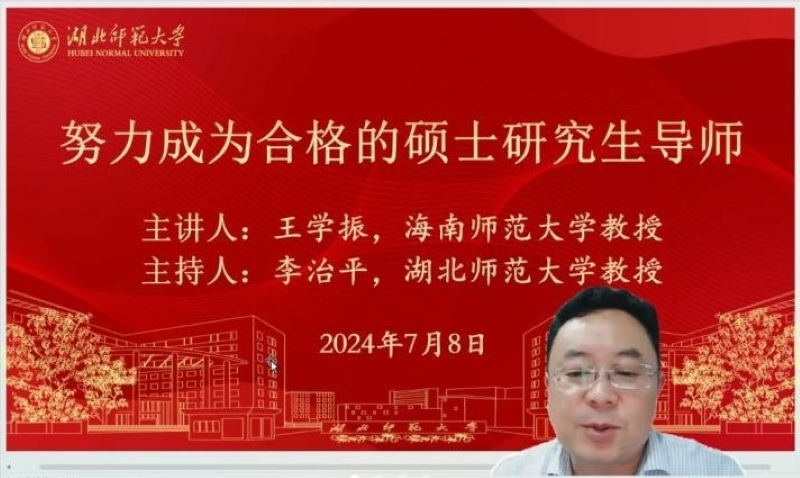 为全面落实立德树人根本任务,加强导师队伍建设,2024年7月8日下午,yl8cc永利线路检测中心进行了硕士研究生导师培训会,海南师范大学yl8cc永利线路检测中心院长王学振教授应邀作线上专题报告,报告会由yl8cc永利线路检测中心院长李治平教授主持,yl8cc永利线路检测中心全体硕士研究生导师参加会议。