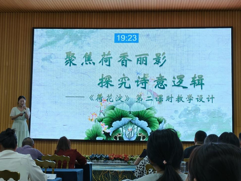 团风中学的周芳老师讲了一位在错位中用血液浇灌出血泪之花的诗人—李煜,讲解他以乐景写哀情,用春水最美的景象衬托出最绝望的愁思。