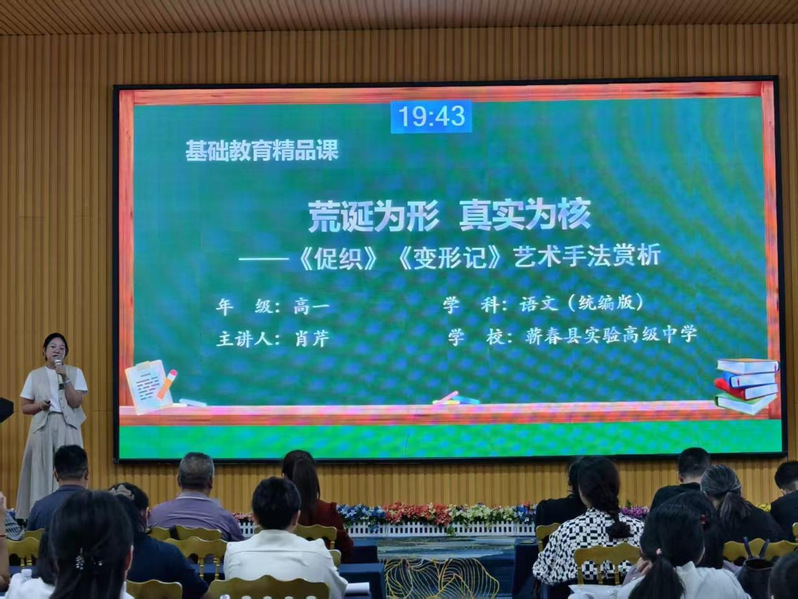 蕲春县实验高级中学肖芹老师以《荒诞为形真实为核》为题,引导学生对比赏析《促织》与《变形记》中的艺术手法,总结出以荒诞手法更能增强讽刺的效果和批判的力度。