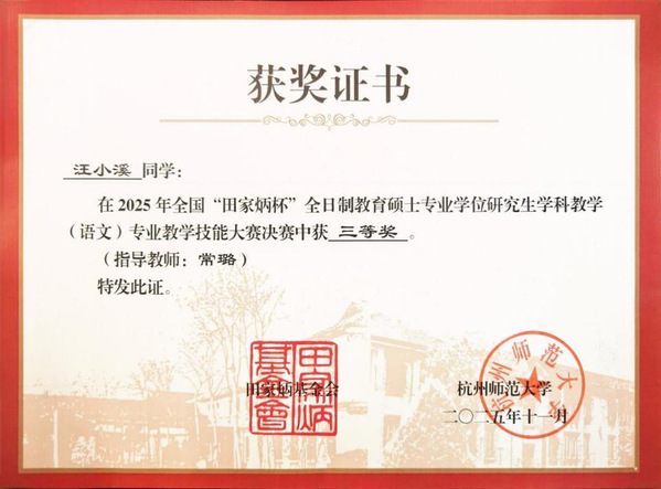 近日,在2025年全国 “田家炳杯” 全日制教育硕士专业学位研究生学科教学(语文)专业技能大赛中,yl8cc永利线路检测中心2023级研究生汪小溪凭借扎实的专业能力与出色的教学表现,获得全国三等奖。