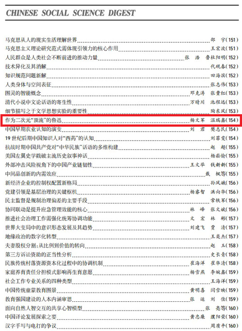 《中国社会科学文摘》是国内学术界公认的三大文摘之一,由中国社会科学院主管,中国社会科学杂志社主办,是中国社会科学领域具有重要影响力的文摘刊物,是展示中国人文社会科学前沿学术成果的权威期刊。