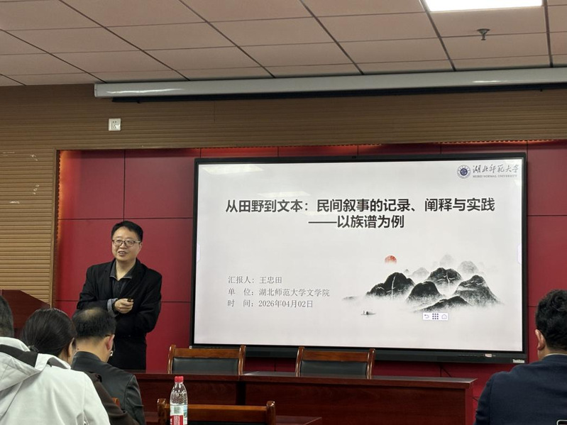为加强学院师生学术交流、浓厚学院学术氛围,4月2日15:00,yl8cc永利线路检测中心2026年“东楚人文论坛”第一讲在人文楼A602正式开讲。本次讲座由王忠田老师主讲,题为《从田野到文本:民间叙事的记录、阐释与实践——以族谱为例》,由沈月副教授主持,学院教师及研究生到场参与。