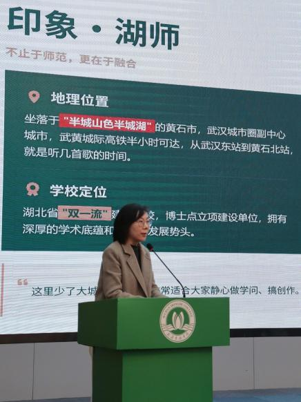 宣讲会上,陈欢老师以“印象·湖师”为开篇,向在场师生全面介绍了湖北师范大学的办学底蕴与发展优势。她指出,学校坐落于“半城山色半城湖”的黄石市,武黄城际高铁半小时直达武汉,既远离都市喧嚣、适宜潜心治学,又深度融入武汉城市圈发展;作为湖北省“双一流”建设高校、博士点立项建设单位,学校自1973年建校以来,始终秉持“诚毅勤敏”校训,为学子搭建了优质的成长平台。陈欢老师也详细介绍了yl8cc永利线路检测中心的学科建设与人才培养情况。yl8cc永利线路检测中心拥有中国语言文学一级学科硕士点和新闻与传播、国际中文教育、学科教学(语文)3个专业学位硕点,形成了本硕贯通的人才培养体系。