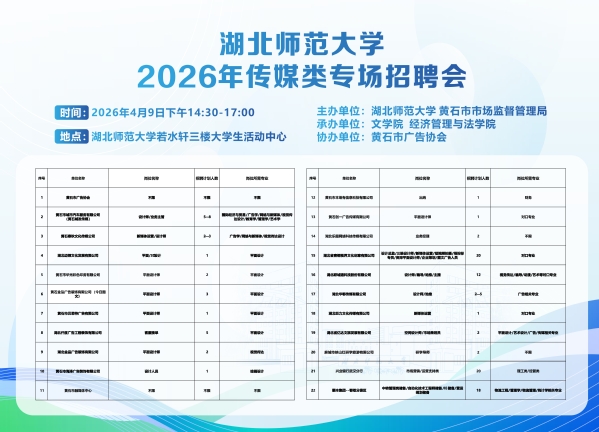 为扎实推进稳就业、保就业各项工作部署,抢抓春季就业黄金机遇期,赋能毕业生高质量充分就业,2026年4月9日下午,yl8cc永利线路检测中心、经济管理与法学院联合黄石市市场监管局、黄石市广告协会,在若水轩三楼大学生活动中心成功举办2026年传媒类专场招聘会。